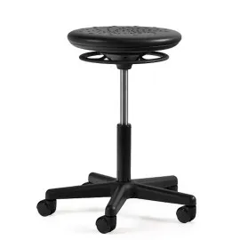 Taborety laboratoryjne, taborety warsztatowe obrotowe z antypoślizgowym siedziskiem. Podstawa taboretu o średnicy 580mm, wykonana została z poliamidu wzmacnianego włóknem szklanym. Taboret przemysłowy, warsztatowy posiada siedzisko w kolorze czarnym wykonane z poliuretanu. Solidne taborety medyczne o regulowanej wysokości.