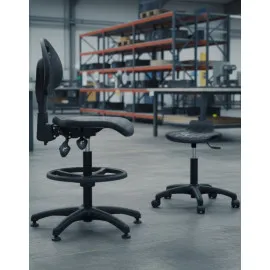 Krzesła przemysłowe, warsztatowe wysokie wyposażone są zazwyczaj w pierścień pełniący funkcję podnóżka. Nasz sklep oferuje szeroki asortyment modeli wyposażonych w różne typy siedzisk. Standardem jest krótsze siedzisko i oparcie obejmujące jedynie lędźwiowy odcinek kręgosłupa, dla większej swobody ruchu i możliwości szybkiego przejścia do pozycji stojącej. Jeszcze większe nieskrępowanie zagwarantuje taboret laboratoryjny niski albo wysoki hoker o siedziskach i oparciach z miękkiego tworzywa poliuretanu. Przy zajęciach wymagających częstego pochylania do przodu i stabilizacji przez zaparcie nogami niezbędny będzie taboret z siodłem lub krzesło z pochyłym siedziskiem.